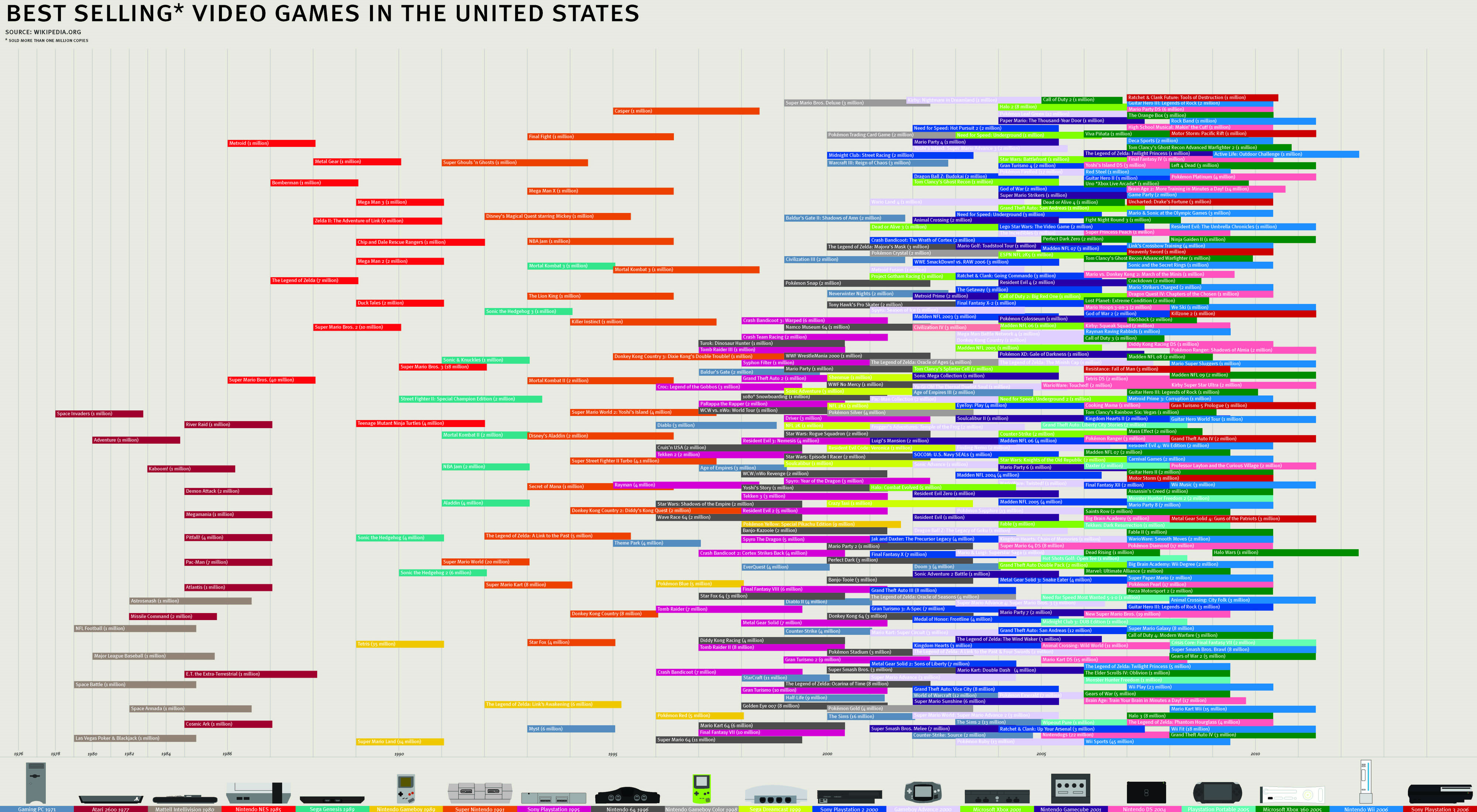 Une image vient d’être publiée schématisant les plus grosses ventes de jeux sur plus de 30 ans. On peut voir que les 40 millions de Super Mario Bros ont été battus par les 45 millions de Wii Sport sur Wii… Il est intéressant de voir aussi que Pac-Man sur Atari 2600 c’est 7 millions de vente, et Pitfall aussi sur Atari 2600 c’est 5 millions de vente! Pour voir l’image en grand et en faire votre propre analyse, cliquez ICI.